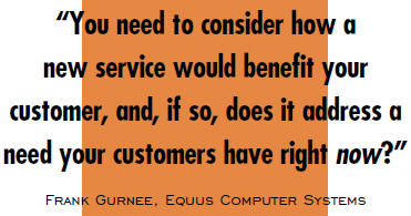 When you consider adding services that complement your current business offerings, you’ll narrow the field down quite a bit, but to get more specific, you’ll need to consider your existing customer base. “Specifically, you need to consider how a new service would benefit your customer, and, if so, does it address a need your customers have right now?” says Frank Gurnee, VP of channel at Equus Computer Systems. Gary Pica, CEO of TruMethods, also advises, “Imagine your best customer asking you, ‘What’s the best way you could take care of our technology?’ What tools, processes, and services would you put into place? That’s what you should be offering each customer.”