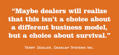 In seeking advice and input on this topic from various industry leaders, Terry Zeigler, president/ CEO of Datacap Systems Inc., had some excellent thoughts worth sharing. “We’ve all been talking to dealers from the perspective of how good it is for them to do rental programs because they will earn more money over the life of the merchant account than they would by selling the product outright,” he says. “So what? The dealer thinks he is OK with his current financial model as is, and he’s being asked to do something different just for fun.”
