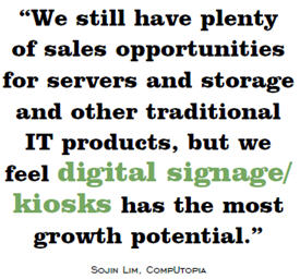 Lim says CompUtopia is enjoying high margins on digital signage because there’s not a lot of competition among resellers for the work right now. “Because these sales are complex and require skills that many resellers don’t possess, we find ourselves competing with either a few niche players or one of the huge AV companies, which aren’t as flexible with back end systems integration as we are.”