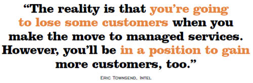 If you’re considering making the move to selling managed services, you need to take into consideration a few key things you’ll need to do to ensure success. First, you need to assess your current customers to determine how ready they are to make the move. Townsend recommends segmenting your customers into three categories: A, B, and C. “Your ‘A’ customers are the ones who have been asking you if you offer services, ‘B’ customers are the ones you’ve had for a long time and you’ve done project work for them in addition to selling hardware and software,” he says. “A ‘C’ customer only buys hardware or software and you only hear from them once a quarter. The reality is that you’re going to lose some customers when you make the move to managed services. However, you’ll be in a position to gain more customers, too.”
